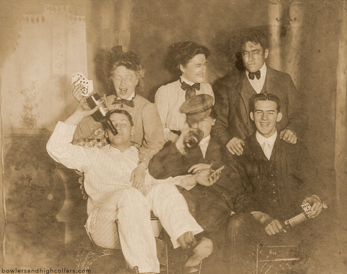 A funny photograph. You can tell he’s the one who’s worried about something or he’s just bleary-eyed from the booze. The others are all having a good time with it. One of the men in front is in his pajamas. What was the motive behind this photo? Was it a last minute decision? They all have their eyes closed and acting drunk with cards and bottles, only Dana is looking off acting serious. I have this feeling he was directing someone. The photograph has some silvering to it, yet it is quite interesting and humorous.