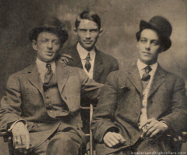 A very relaxed pose and a smile that is unusual for the time. You find more of those later from the 1910s on. Of course, they’re all holding a cigar in their hand, that was not unusual! He looks like he was amused and was saying something. His friend to the right who’s looking off has this expression like he’s about to smile. The one in the middle has a very intense look in his eyes. All in all, one of the top two favorite tintypes in my collection, the other being this one.