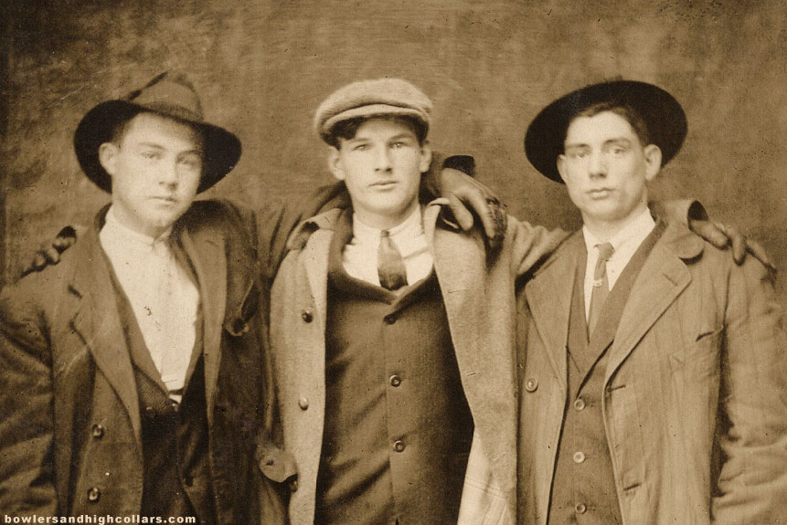 Three tight buddies in gloves, overcoats and American Boston shoes (sometimes called Bulldog shoes) which made their debut in 1910. I have nothing more to say about this one. This sweet photo speaks for itself, and of course I love the fashion!