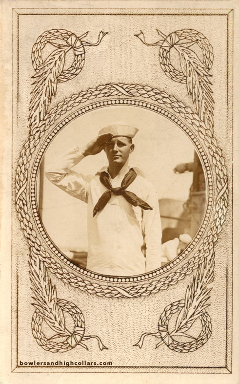 A very beautifully designed RPPC of a sailor saluting aboard a ship with another one in the background. There is a name on the back: Elva.