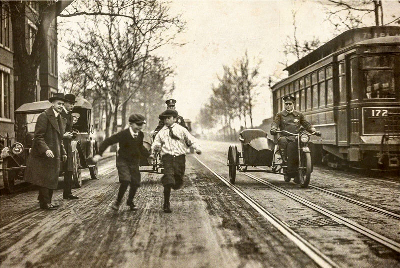 From what I know this picture was taken in Washington D.C. It’s widely available in print but I don’t know who the photographer was. A great, great picture however, of two boys running ahead of two cops on motorcycles and side cars. Most likely taken in the late 10s, it gives a furtive taste of how free kids were to roam the streets, something I’m happy to say I am old enough to have experienced myself, free of smart phones, free to run wild until you got home and mom gave you a scolding for staying out so late.