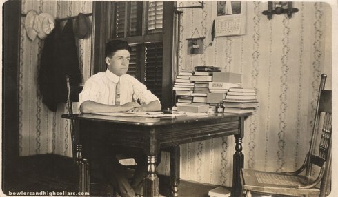 A studious looking gent at his desk, his coats and hats hanging behind him, and with a pile of books stacked by the wall. There’s an ink bottle on the table, and the calendar dates this picture to September 1912. The window is open with the blinds closed to shield the room from the sun.