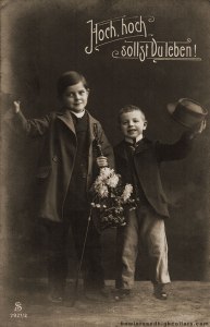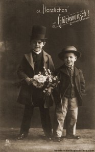 These two German kids are too adorable for words! The older one stands with a comically high bowler on his head and a large bouquet of daisies, while his little toddler friend has his hands in pockets with a mini walking stick on the arm and a pork pie hat. They’re posing like pros in their grown-up suits, and I just about died!